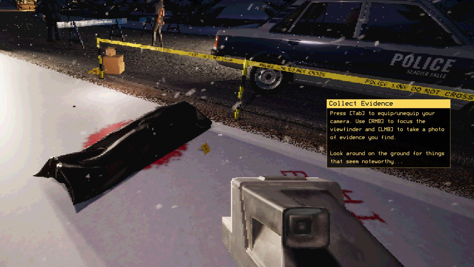 TAB to toggle camera, RMB to look through viewfinder, LMB to take photos of evidence